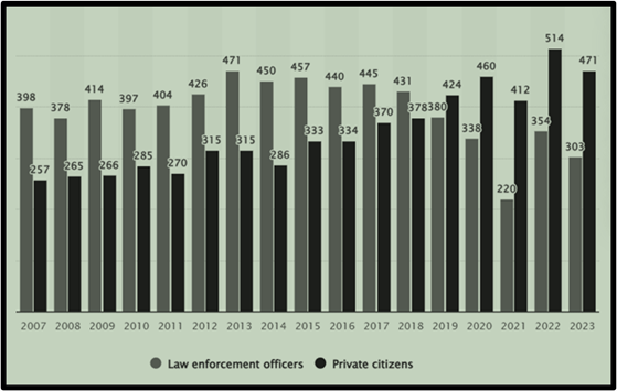 Note the consistent shift starting in 2019 as private Citizen justifiable homicides surpass those from US law enforcement. There are more (total, not by percentage) justified defensive shootings by Citizens than there are by police officers that results in the fatality of the criminal. Source: FBI Crime Data and Statista